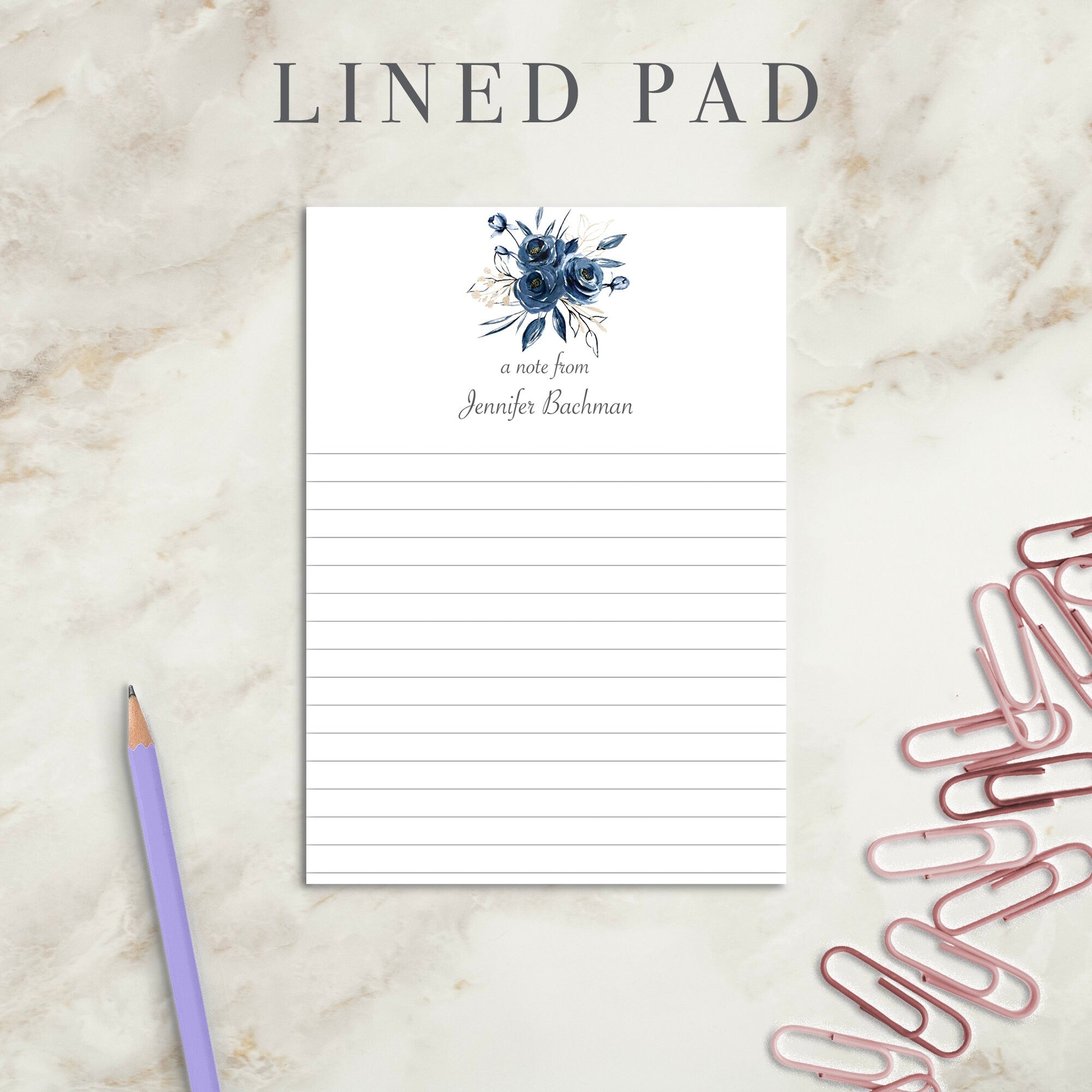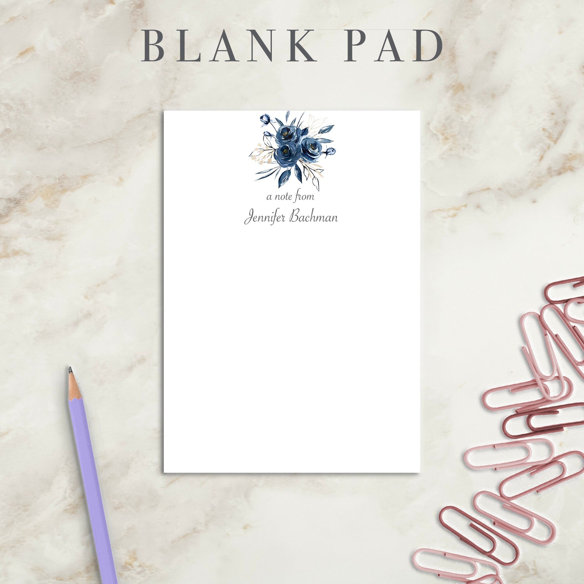 - Personalized notepad customized with phrase and name.